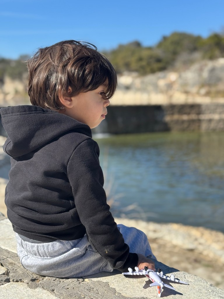 So I have made it a point to add outside time to our daily routine. He gets double the time with daycare activities, but even spending time on our patio seems to make a huge difference. Something so simple has such a big impact on both of us. The fresh air resets us; it slows us down to be more present and also enjoy the smallest things. He loves to people watch, car watch, plane watch...and I love the quietness, the sunshine and seeing the world through his eyes. Being outside doesn't have to be something big or planned, it's as simple as setting up a coloring station and being in your yard or porch...that alone makes a difference on us both.